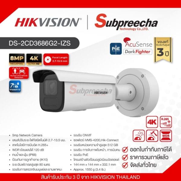 DS-2CD3686G2-IZS / Hikvision กล้องวงจรปิด 8 MP (Lens2.7-13.5mm) AcuSense