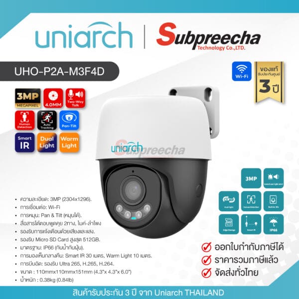 Uho-P2A-M3F4D / Uniarch กล้องวงจรปิด 3MP (Lens4.0mm) (Wi-Fi) Outdoor Pan & Tilt Camera