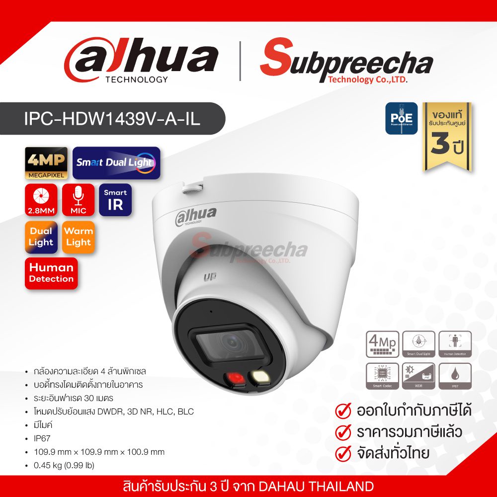 IPC-HDW1439V-A-IL / Dahua กล้องวงจรปิด 4 MP (Lens2.8mm) (PoE) Smart Dual Light
