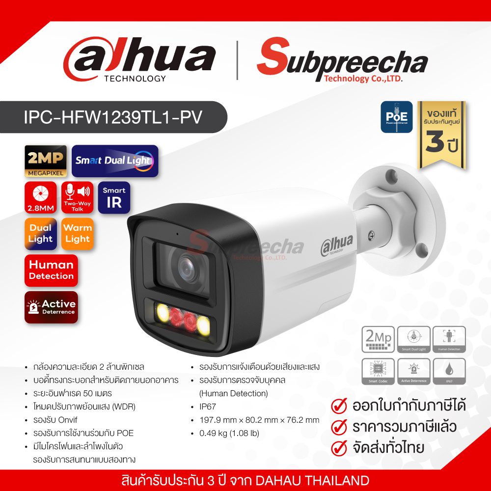 IPC-HFW1239TL1-PV / Dahua กล้องวงจรปิด 2 MP (Lens2.8mm) Dual Light Active Deterrence