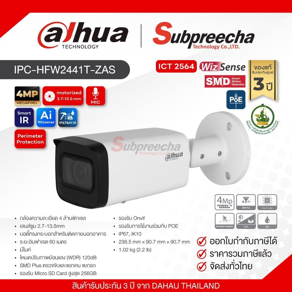 IPC-HFW2441T-ZAS / Dahua กล้องวงจรปิด 4 MP (Lens 2.7-13.5mm) (Spec ICT) (PoE) WizSense