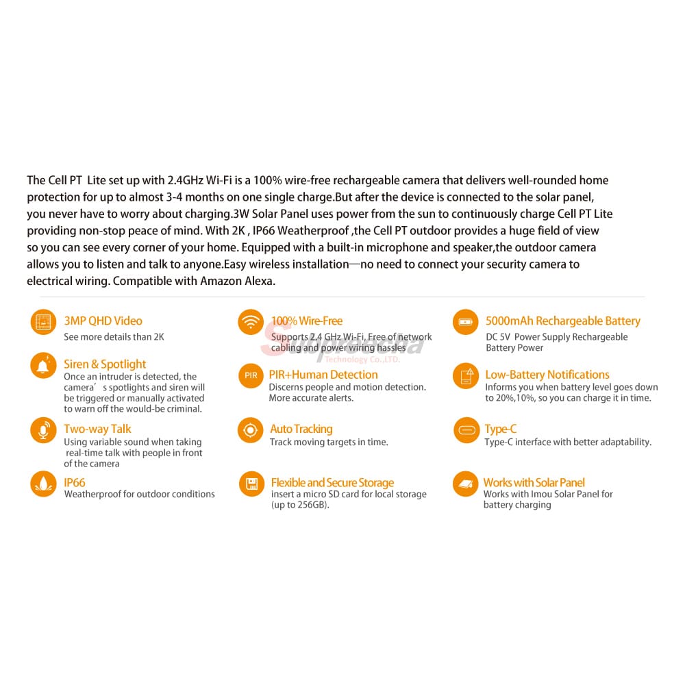 The Cell PT Lite set up with 2.4GHz Wi-Fi is a 100% wire-free rechargeable camera that delivers well-rounded home protection for up to almost 3-4 months on one single charge.But after the device is connected to the solar panel, you never have to worry about charging.3W Solar Panel uses power from the sun to continuously charge Cell PT Lite providing non-stop peace of mind. With 2K , IP66 Weatherproof ,the Cell PT outdoor provides a huge field of view so you can see every corner of your home. Equipped with a built-in microphone and speaker,the outdoor camera allows you to listen and talk to anyone.Easy wireless installation—no need to connect your security camera to electrical wiring. Compatible with Amazon Alexa.