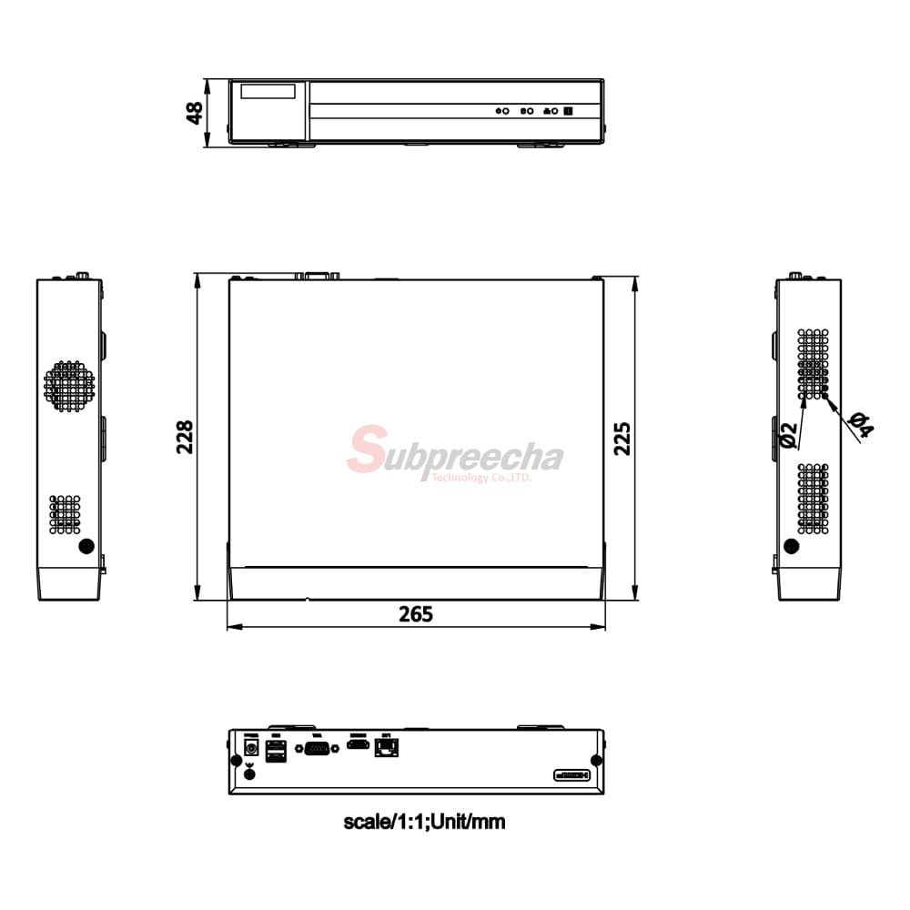 - ขนาด (กว้าง × ลึก × สูง) 265 × 225 × 48 มม. (10.4″ × 8.9″ × 1.9″)