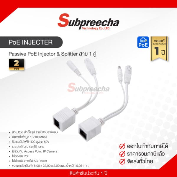 Passive PoE Injector & Splitter (สาย 1 คู่) – อุปกรณ์จ่ายไฟผ่านสายแลน 10/100Mbps สำหรับ Access Point, IP Camera