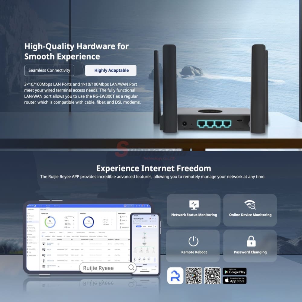 - บริหารจัดการเครือข่าย ตรวจสอบสถานะ และรีบูตได้จาก Ruijie Cloud/App ฟรีตลอดชีพ