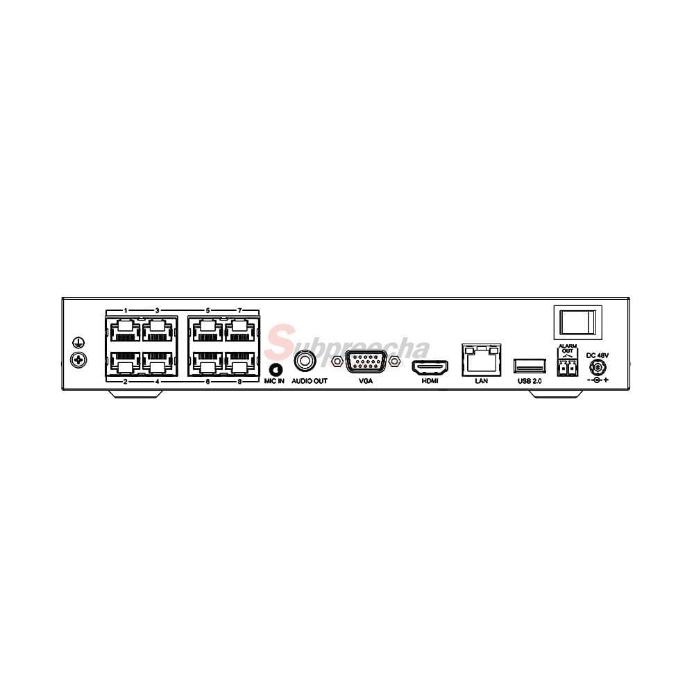 – Up to 10-ch IP camera accesses – Incoming/Outgoing bandwidth: 80Mbps/80Mbps – S+265, H.265, S+264, H.264 video formats – Max. decoding capability: 6MP(30fps)×1 or 1080P(30fps)×4 – Up to 4 channels-ch synchronous playback – Up to 10 TB capacity for each HDD – Simultaneous HDMI and VGA outputs – HDMI output at up to 1080P resolution – 1×RJ-45, 10/100 Mbps self-adaptive Ethernet port – PoE interface, 8×RJ45, 10/100 Mbps self-adaptive Ethernet port – S+ 265 compression effectively reduces the storage space by up to 75% – Support cloud upgrade