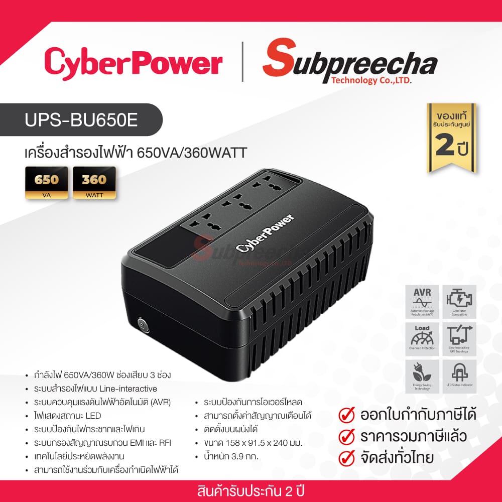 CyberPower UPS-BU650E เครื่องสำรองไฟฟ้า 650VA/360WATT ระบบ Line-interactive พร้อม AVR กันไฟกระชาก